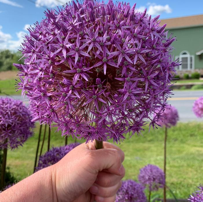 Allium 'Globemaster' reaches 28 to 36 inches tall, featuring enormous 8 to 10-inch violet flower globes that bloom from late spring into summer. Thriving in full sun and well-drained soil, it is drought-tolerant, deer-resistant, and attracts pollinators. Its sturdy stems ensure lasting ornamental appeal. Ideal for borders, it pairs well with peonies and irises. 'Globemaster' was developed from a cross between Allium macleanii and Allium christophii.