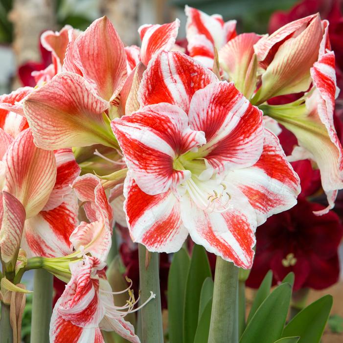 Amaryllis ‘Clown’ reaches 18 to 24 inches tall, featuring 6 to 8 inch blooms in crisp white with bold, cherry‑red stripes—its classic candy‑cane pattern making it one of the most recognizable bicolor varieties. Each jumbo-sized bulb (36/+) produces three thick stalks, typically carrying four to five blossoms per stem, blooming 8 to 12 weeks after planting.