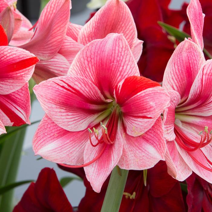 Amaryllis 'Gervase' reaches 24 inches tall, featuring 8 to 10 inch blooms in varying shades of pink with deep red streaks and bright cherry anthers. Each jumbo-sized bulb (36/+) produces three to four thick stalks, with multiple flowers per stem, blooming 8 to 12 weeks after planting.