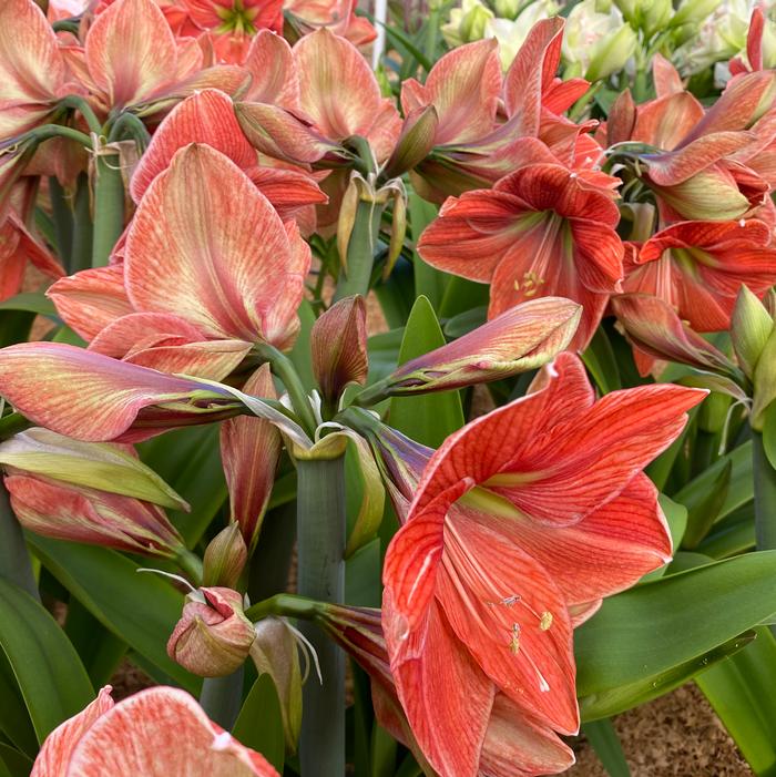 Amaryllis 'Terra Cotta Star' reaches 20 to 25 inches tall, featuring 6 to 8 inch blooms in terra cotta orange with a bright green throat. Each jumbo-sized bulb (36/+) produces two to three thick stalks, with four to five flowers per stem, blooming 8 to 12 weeks after planting.