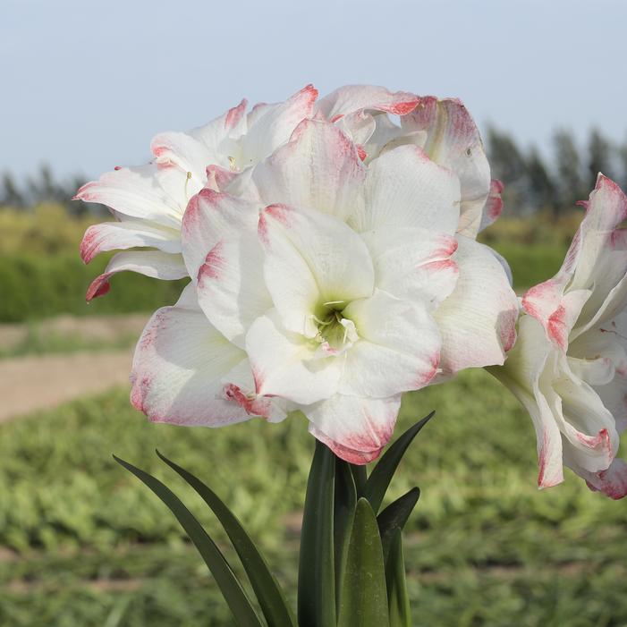 Amaryllis 'Amadeus' reaches 18 to 24 inches tall, featuring fully double, ruffled white blooms with soft red streaking and a pale green throat. Each bulb (28/30 cm or 36/38 cm jumbo) produces two to three thick stalks, with four to six flowers per stem, blooming 40-45 days after planting—ideal for holiday sales.