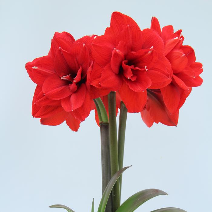 Amaryllis 'Double King' reaches 20 to 25 inches tall, featuring fully double, velvety red blooms with subtle white markings radiating from the center to the petal edges. Each bulb (28/30 cm or 36/38 cm jumbo) produces two to three thick stalks, with four to six flowers per stem, blooming 40-45 days after planting—ideal for holiday sales.