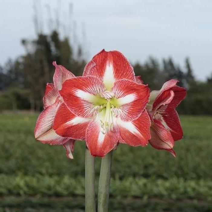 Amaryllis 'Minerva' reaches 20 to 25 inches tall, featuring large, bright red flowers with a brilliant white six-pointed star emanating from the pale green throat. White striations between the star shafts add a sense of depth and dimension. Each bulb (28/30 cm or 36/38 cm jumbo) produces two to three thick stalks, with three to four large blooms per stem, blooming 50-55 days after planting—ideal for holiday sales.