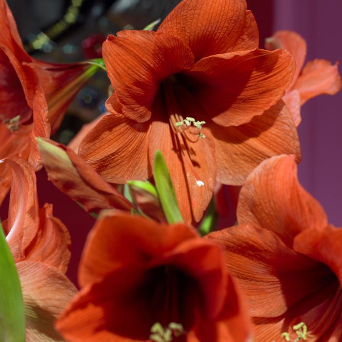 Amaryllis 'Souvereign' reaches 15 inches tall, featuring tangerine-orange flowers. Each bulb (28/30 cm or 36/38 cm jumbo) produces two to three thick stalks, with three to four large blooms per stem, blooming 45 to 50 days after planting—ideal for holiday sales.