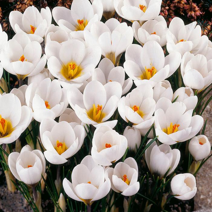 Crocus chrysanthus 'Ard Schenk' reaches 3 to 4 inches tall, featuring pristine white blooms with a luminous golden heart and prominent orange-yellow anthers. These early-spring flowers open only in bright light, closing at night or on cloudy days. Their compact form and graceful petals create a striking contrast against fresh green foliage.