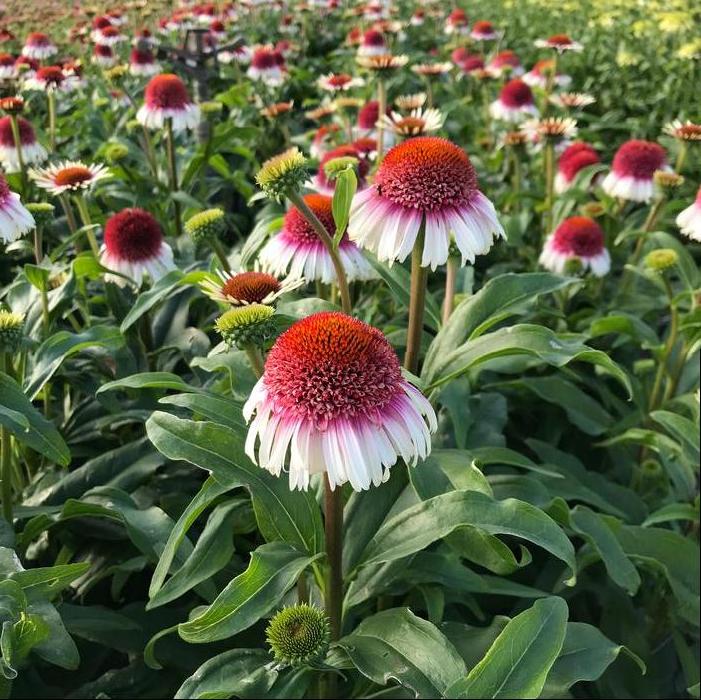 Echinacea 'Strawberry and Cream' is a vigorous, double-flowered coneflower with creamy white outer petals and a lush strawberry-hued pompom center. Blooming prolifically from midsummer into autumn, it draws in bees and butterflies while fending off browsing deer. Its upright stems hold blossoms well above the foliage, making it a striking choice for bouquets, and its resilience in dry, sunny conditions makes it a dependable performer in well-drained borders.