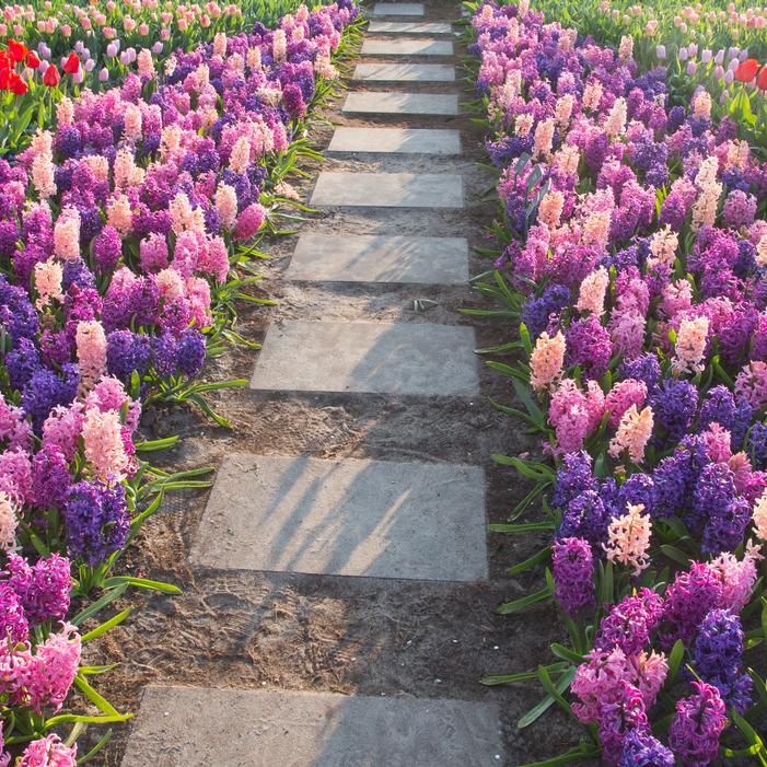 Hyacinthus orientalis 'Cotton Candy Mix' reaches 8 to 12 inches tall, featuring a delightful blend of pastel-colored blossoms in shades of pink, violet, and blue. These fragrant flower spikes evoke the soft, airy hues of cotton candy, creating a whimsical and elegant spring display.