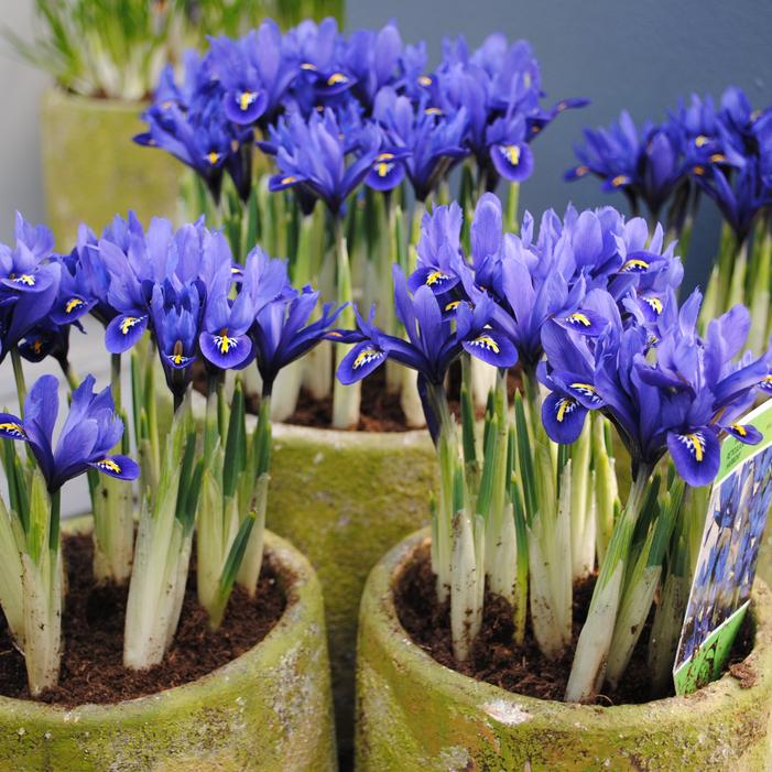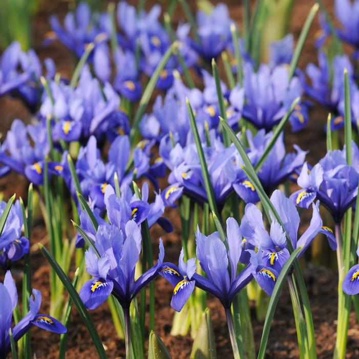 Iris reticulata 'Harmony' is a dwarf iris, reaching 4 to 5 inches in height. It features royal blue flowers with a white-rimmed gold crest on each fall. The slender, grass-like gray-green leaves elongate to 15 inches after bloom before disappearing in late spring as the plant goes dormant.