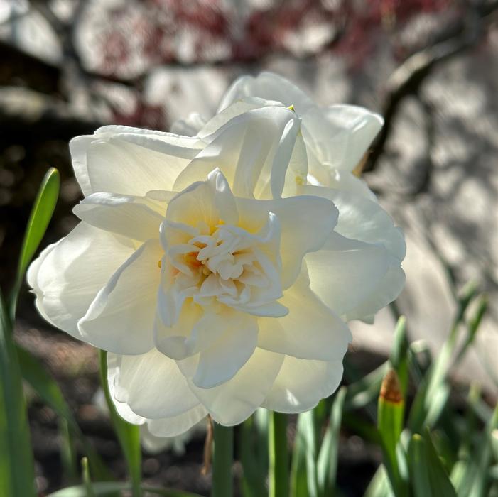 Narcissus 'Obdam' is a double daffodil, reaching 14 to 18 inches in height. It produces large, creamy-white blooms with soft yellow centers that gradually fade to pure white, creating an elegant, layered effect. The flowers appear in mid-to-late spring and are sweetly fragrant, making them excellent for cut arrangements. Thriving in full sun to part shade, 'Obdam' prefers well-drained soil and is deer-resistant, rabbit-resistant, and drought-tolerant.
