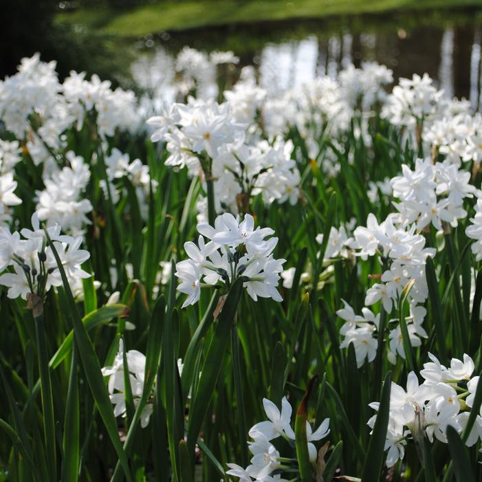 Narcissus 'Nir' is a tazetta daffodil, primarily suited for indoor forcing. It reaches 14 to 18 inches in height and produces clusters of pure white blooms per stem, with a delicate, open cup. The flowers appear 3–4 weeks after planting, making them ideal for holiday displays and winter blooms.