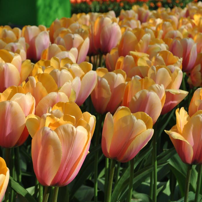 Blushing Impression is a Darwin Hybrid tulip featuring large, goblet-shaped blooms that shift from peach-yellow to raspberry pink. Its sturdy stems reach 20 to 22 inches tall, supporting flowers up to 6 inches across. Blooming in mid to late spring, it thrives in full sun and well-drained soil—ideal for borders, mass plantings, and cut arrangements.