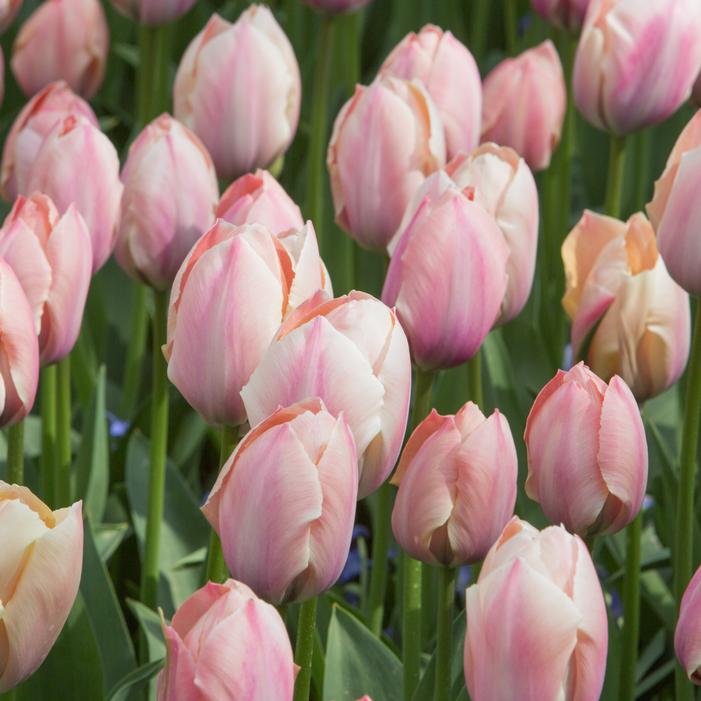 Salmon Van Eijk is a Darwin Hybrid Tulip with large, cup-shaped blooms in creamy salmon-pink, sometimes feathered with dusty rose. Its sturdy stems reach 18 to 22 inches, supporting flowers up to 6 inches across. Blooming in mid to late spring, it thrives in full sun and well-drained soil, making it ideal for borders, mass plantings, and cut arrangements. A sport of Van Eijk.