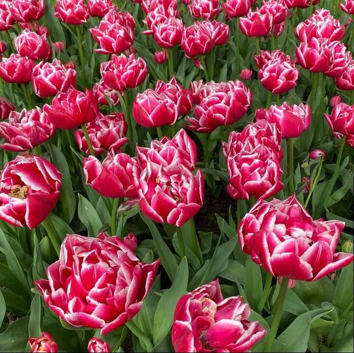 Tulip ‘Columbus’ is a Double Early Tulip with large, peony‑shaped blooms in a striking blend of rosy pink and creamy white. Each flower features lush, layered petals that create a full, rounded appearance, with the pink deepening toward the center for a vivid two‑tone effect. Its sturdy stems reach 12 to 14 inches, supporting blooms that can grow up to 5 inches across, opening wide in sunlight.
