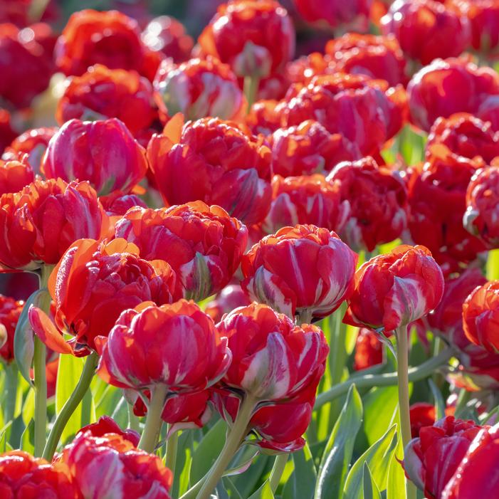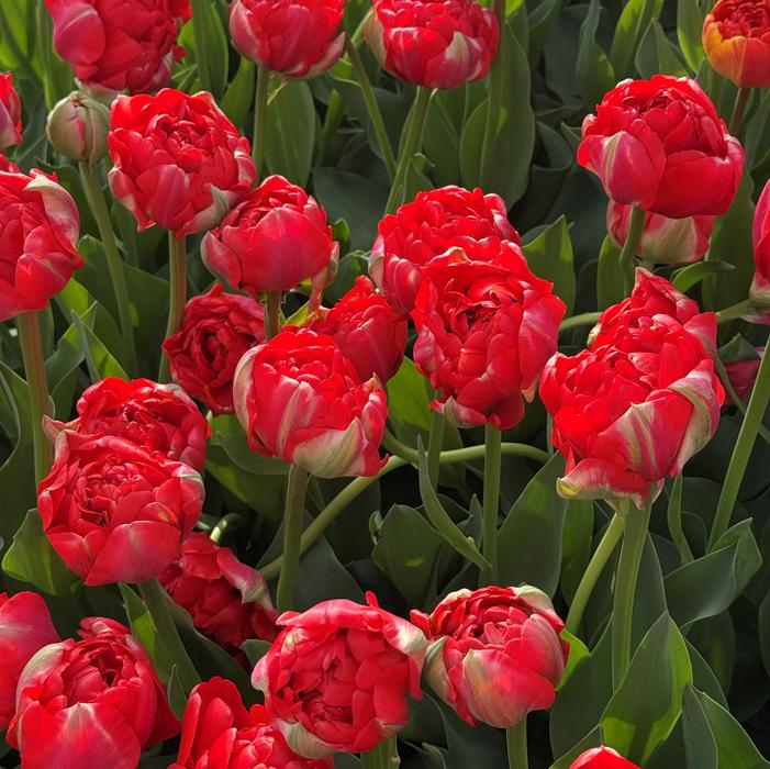 Tulip ‘Bombastic Red’ is a Double Late Tulip with large, peony‑shaped blooms in a bold, saturated crimson‑red. Each flower is packed with lush, layered petals that create a full, rounded silhouette, holding its rich color beautifully even as the blooms open wide in sunlight. Strong stems reach 18 to 22 inches, supporting flowers up to 5 inches across, giving this variety impressive presence in the late‑spring garden.