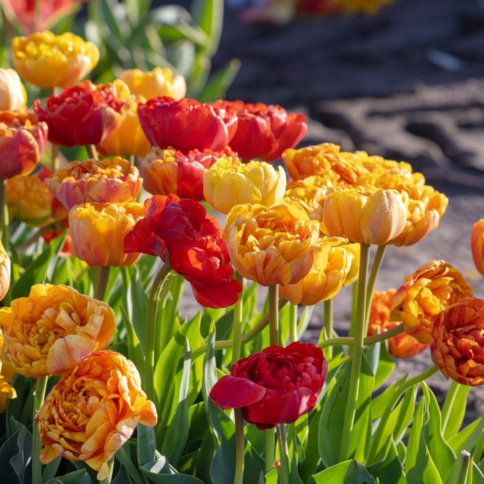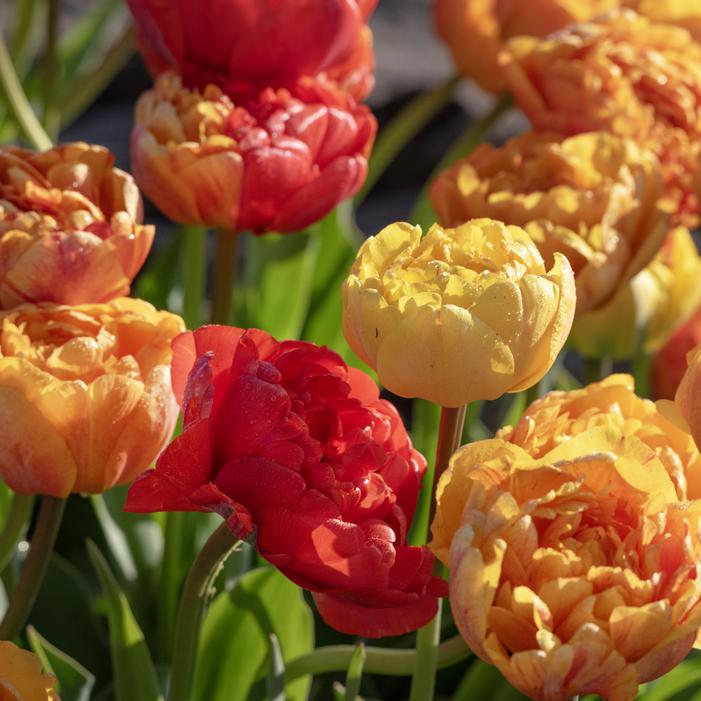 Spring Joy Mix is a Double Mid Tulip blend featuring warm tones of orange, and yellow, creating a radiant, sunlit effect. These peony-like flowers have densely packed petals, adding texture and depth to gardens. Their sturdy stems reach 14 to 20 inches, supporting blooms that span up to 4 inches across. Blooming in late spring, they thrive in full sun and well-drained soil, making them ideal for borders, containers, and cut arrangements.