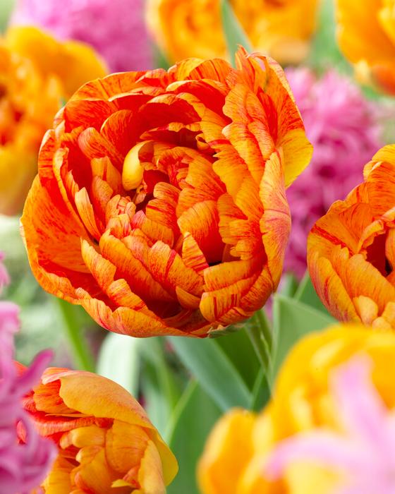 Planting: Plant in fall once soil temperatures fall below 55°F. Set bulbs 6–8 inches deep, pointed end up. Double mid tulips benefit from a spot with good air circulation to support their taller stems and voluminous blooms.