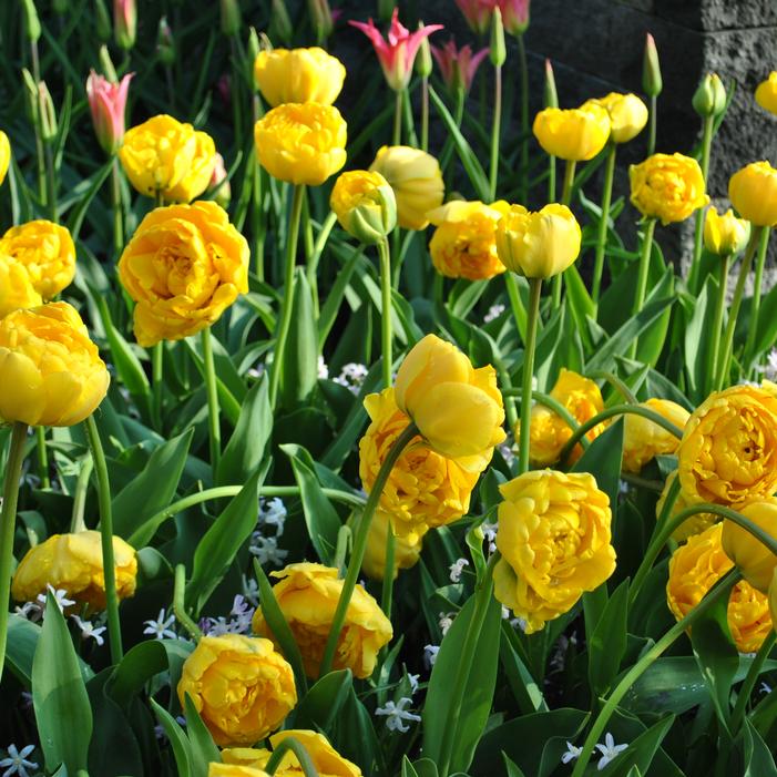 Yellow Pomponette is a Double Mid Tulip with peony-like blooms in golden yellow, featuring a black-flecked throat for striking contrast. Its sturdy stems reach 12 to 20 inches, supporting flowers that can span up to 4 inches across. Blooming in late spring, it thrives in full sun and well-drained soil, making it ideal for borders, containers, and cut arrangements.