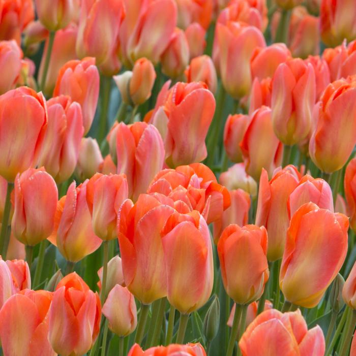 Apricot Emperor is a Fosteriana Tulip with glowing coral-apricot blooms, accented by salmon-pink tones and green markings on the outer petals. Its sturdy stems reach 12 to 16 inches, supporting flowers that can span up to 5 inches across. Blooming in early to mid-spring, it thrives in full sun and well-drained soil, making it ideal for borders, containers, and cut arrangements.