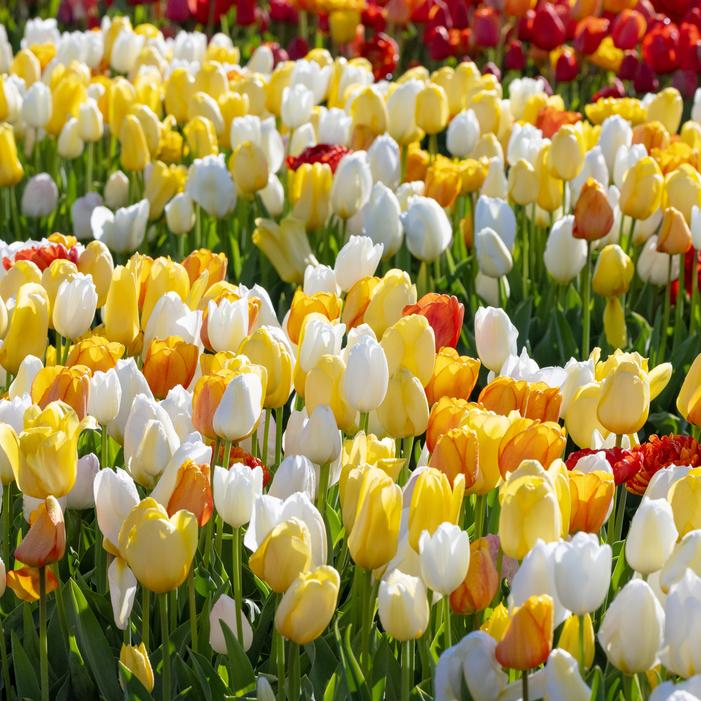 This mix features a diverse range of white and yellow tulips, spanning multiple tulip groups, including Triumph, Darwin Hybrid, Double, Lily Flowering, and Single Late varieties, creating a dynamic, ever-changing display. Tulips in this mix reach 14 to 28 inches tall and thrive in full sun with well-drained soil.