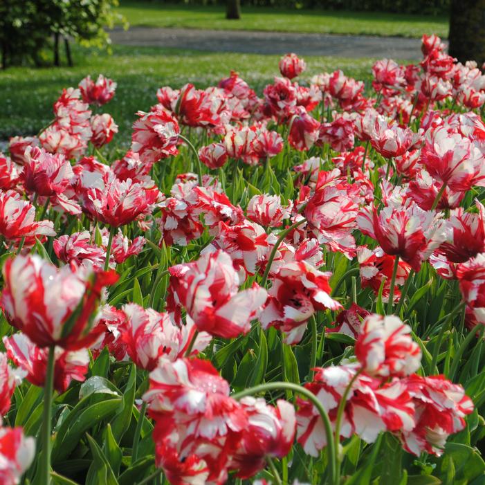 Estella Rijnveld is a late-spring blooming parrot tulip with dramatic, feathery petals in a mix of bright red, white, and flashes of green. As the flower matures, it opens wide, almost flattening out, revealing its bold coloration.