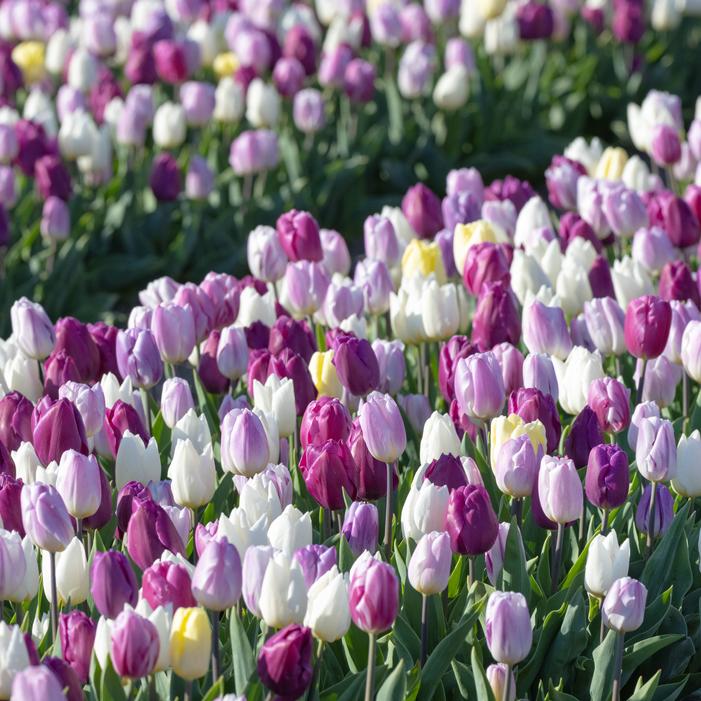 Flag Mix is a Triumph tulip blend, featuring a striking combination of purple, white, and lilac hues. This mix includes varieties like 'Flaming Flag' and 'White Flag', known for their soft, flamed patterns and elegant contrast.