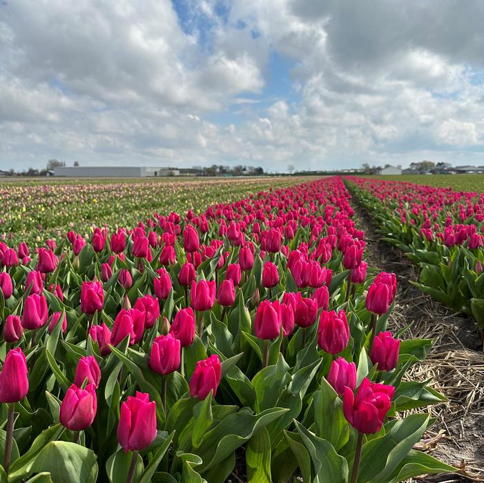 Pink Ardour is a Triumph tulip, known for its vibrant, oversized neon pink blooms that can reach up to 5 inches across. It blooms in mid-spring, standing on sturdy stems that reach 16 to 18 inches tall.