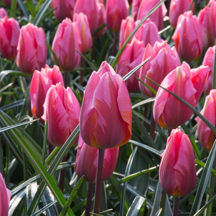 Pretty Princess is a Triumph tulip, known for its bright rose-pink petals flushed with purple flames. It blooms in mid-spring, standing on sturdy stems above broadly lance-shaped leaves edged with a thin creamy-white ribbon.