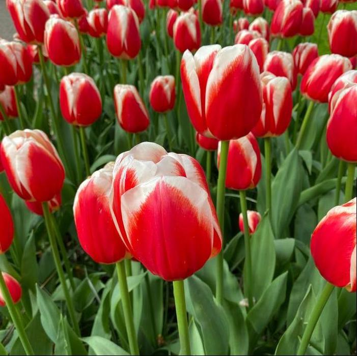 Roman Empire is a Triumph tulip, admired for its dark pink to reddish blooms with creamy petal edges. It is a mid-season variety, standing on sturdy stems that make it excellent for gardens and field plantings.