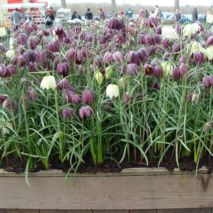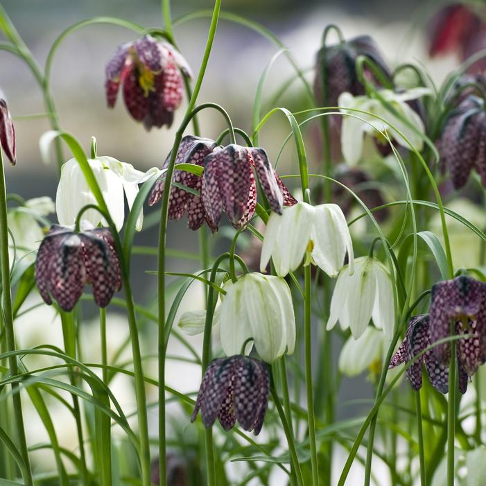 Fritillaria meleagris Mix, commonly known as Checkered Lily, reaches 9 to 12 inches tall, featuring nodding, bell-shaped blooms in shades of deep purple, pink, and white. Each flower displays a distinctive checkered pattern, adding unique texture to the spring garden.